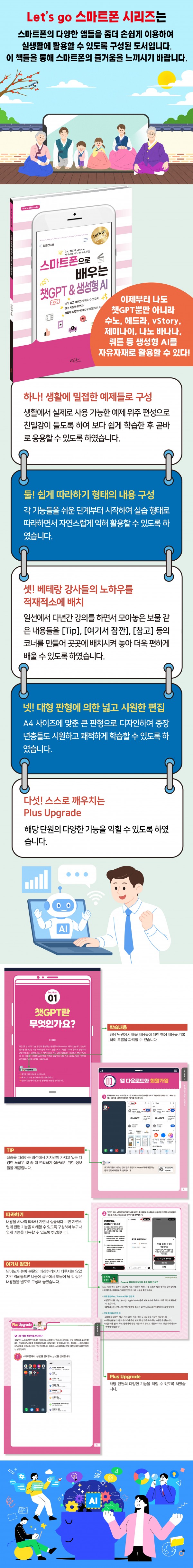 특히 스마트폰 사용자 관점에서 앱 설치, 설정, 대화법, 목소리 활용, 이미지 음악 생성 등 AI활용의 전 과정을 설명하여 누구나 일상 학습 업무에서 AI를 사용할 수 있도록 돕는다.