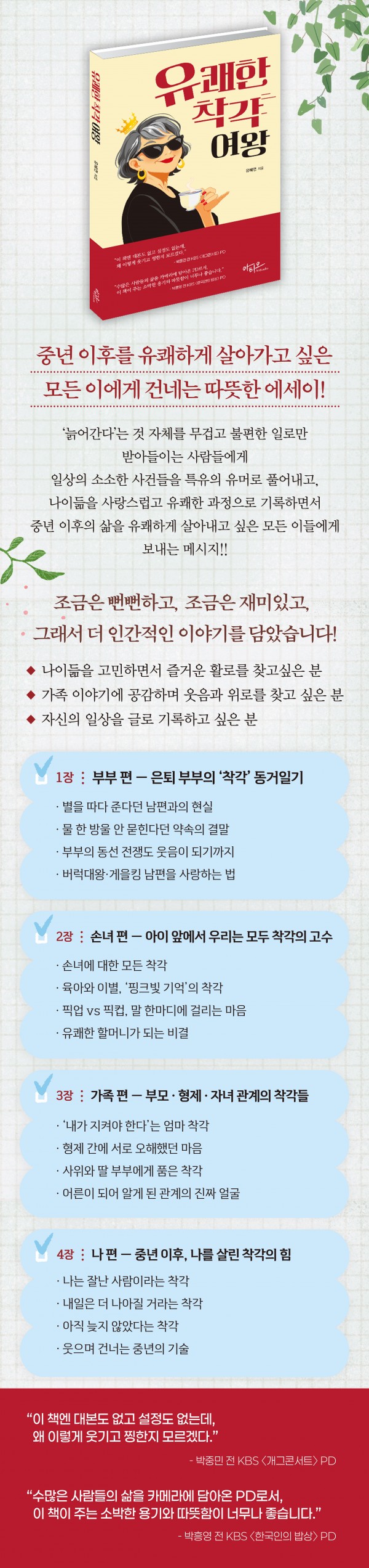 '늙어간다'는 것 자체를 무겁고 불편한 일로만 받아들이는 사람들에게 일상의 소소한 사건들을 특유의 유머로 풀어내고, 나이듦을 사랑스럽고 유쾌한 과정으로 기록하면서 중년 이후의 삶을 유쾌하게 살아내고 싶은 모든 이들에게 보내는 메시지